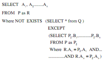 Viewed 4k times 7 Here is an example TA RENTEDAC BOATSC select distinct R1A from RENTED R1 where not exists select from SAILBOAT S where not exists select from RENTED R2 where R1A R2A and R2C SC. Active 2 years 1 month ago. It collects instances of relations as input and gives occurrences of relations as output.
